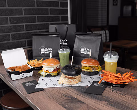 Black And White Burgerest une enseigne de restauration proposant une carte élaborée & généreuse : des burgers gourmets aux recettes originales composés d’un pain noir au charbon végétal, de produits frais et d’un steak race Angus, des limonades Homemade, des desserts variés (shakes, tiramisus, cookies, brownies & muffins), le tout dans une ambiance cosy et chaleureuse.